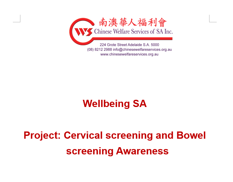 Chinese Welfare Association of SA is committed to providing more convenient, practical and high-quality services to the people in Adelaide with a Chinese cultural background. At the same time, CWS has always paid attention to your physical health. Since 2017, we have put your bowel, cervix and breast health as the top priority.